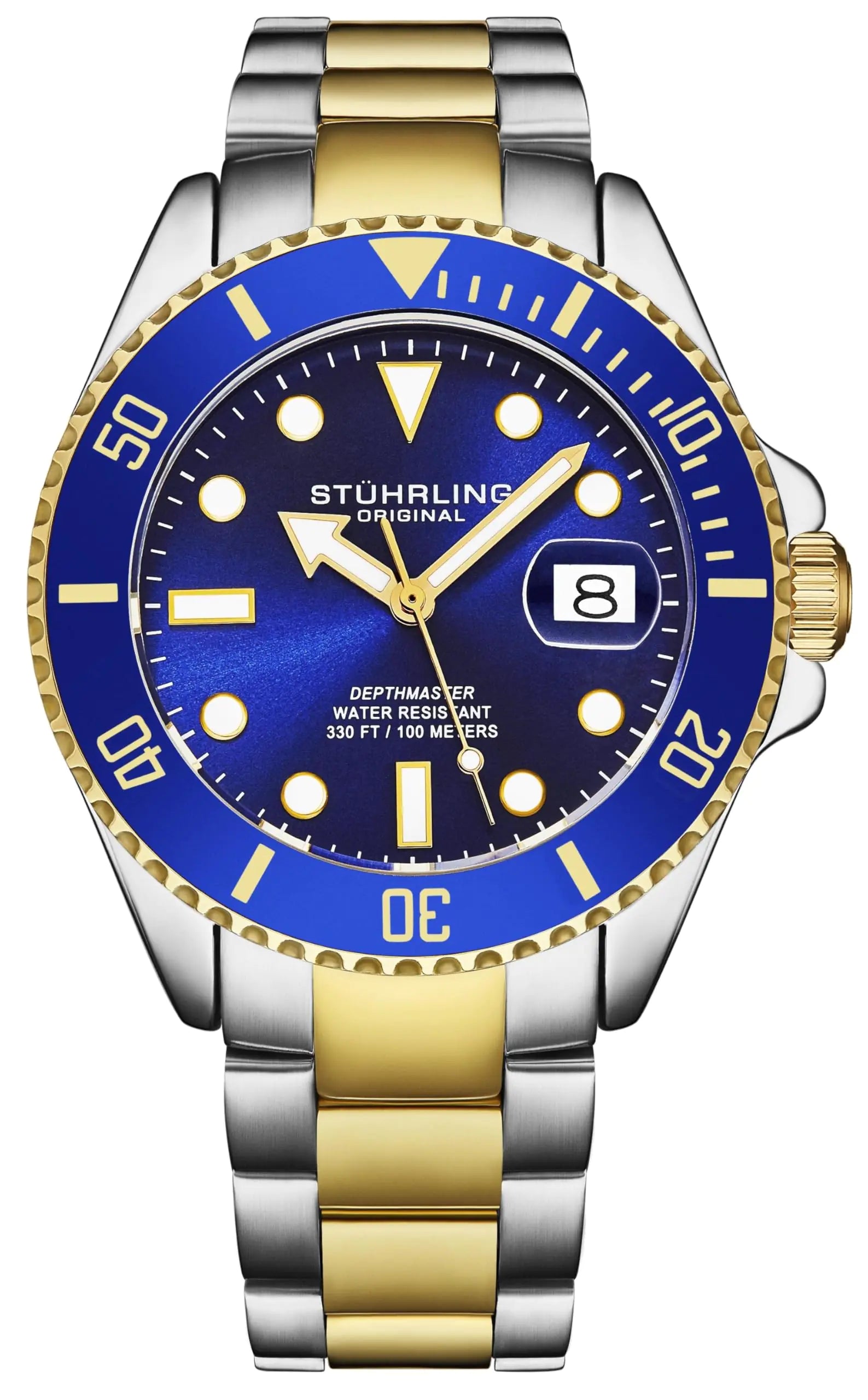 DescriptionThis Stuhrling Original Mens Dive Watch features a stainless steel case and bracelet with a blue dial. It is water resistant up to 100 meters and has a Swiss quartz movement for accurate timekeeping. The watch also has a date display and is powered by a battery. The case is 40mm in diameter and 14mm thick with a mineral crystal face protector. The bracelet is 20mm wide and has a fold-over clasp with safety. The watch has a two-tone gold and silver Bracelet and is perfect for everyday wear or for diving and other water activities.
